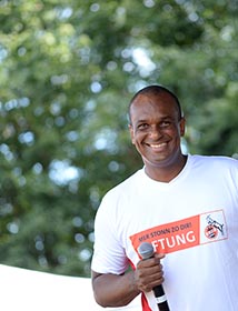 Und genau darum geht es: Farbtöpfe öffnen und die graue Wand bunt streichen, damit endlich Leben aufkommt. Das Leben, so wie es ist. Ronny Blaschke moderiert eine Diskussion mit der Bürgermeisterin der Bundesstadt Bonn Angelica Kappel, dem DFB Integrationsbotschafter Jimmy Hartwig und dem vielfältig engagierten Martin Rietsch. Es gibt einiges zu sehen und zu hören. Infostände von verschiedenen Vereinen und Institutionen bieten Materialien und Gesprächsstoff zum Thema Flüchtlingshilfe. Da ist ein Stand der Bundeszentrale für politische Bildung, die Stiftung 1. FC Köln ist mit einer Hüpfburg vertreten und ein Stand von der Bundeswehr lädt dazu ein, auch hier Vorurteile abzubauen. Ein umfangreiches Bühnenprogramm mit musikalischen Auftritten von Rapper 2schneidig, Alireza Azimi, Lion Baryton und vielen weiteren Musikern sorgt für eine ausgelassene, friedliche Stimmung an diesem sonnigen Tag.
