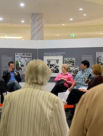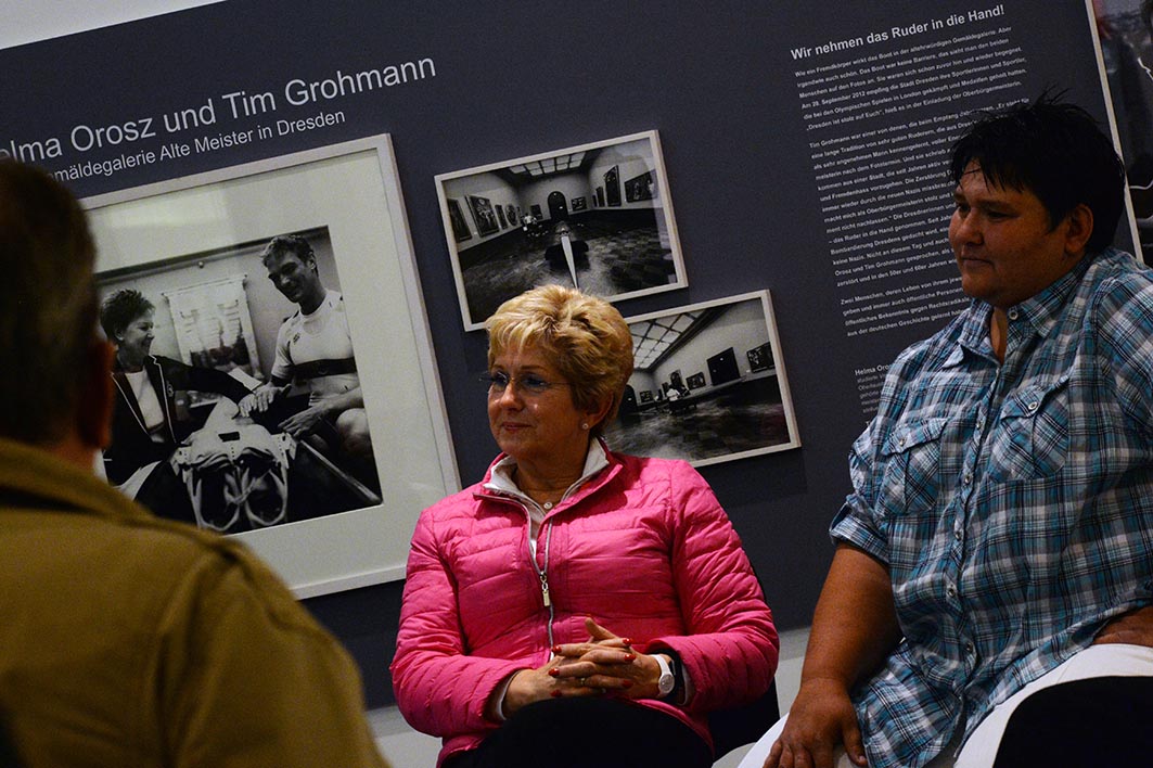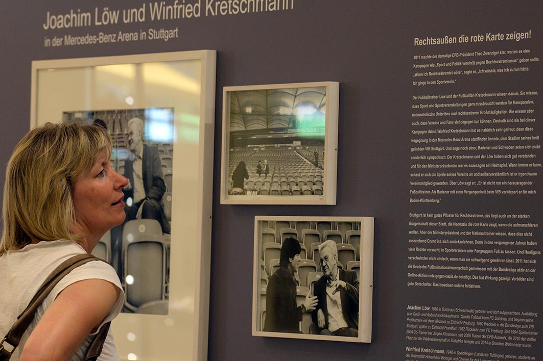Am Tag der Eröffnung sitzt die mehrfache Olympia-Teilnehmerin Sandra Köppen-Zuckschwerdt aus Brandenburg gemeinsam mit der Oberbürgermeisterin Dr. Dietlind Tiemann, dem Trainer des Frauenbundesligisten 1. FFC Turbine Potsdam Bernd Schröder, Marie-Luise Würtenberger vom Bundesministerium des Innern und Angelika Kohlmeier, der Fotografin, auf dem Podium. Sie spricht über das Thema Rechtsextremismus und Diskriminierung im Sport und erzählt vom Startschuss der Ausstellung im September 2014 in Berlin mit Bundespräsident Joachim Gauck und von den Sportlern, die bei der Kampagne mitwirken. Besonders berührt habe sie die Geschichte von Marianne Buggenhagen, die massiv von rechtsextremen Gruppierungen bedrängt und angegriffen wurde, weil sie sich für Fairplay, Demokratie und die Achtung der Menschenwürde einsetzt. Vor dem Podium versammelt sich eine Menschentraube. Es wird fotografiert. Es fallen Zwischenrufe. Viele Menschen laufen vorbei und gucken. Die Ausstellung ist mitten im Geschehen.