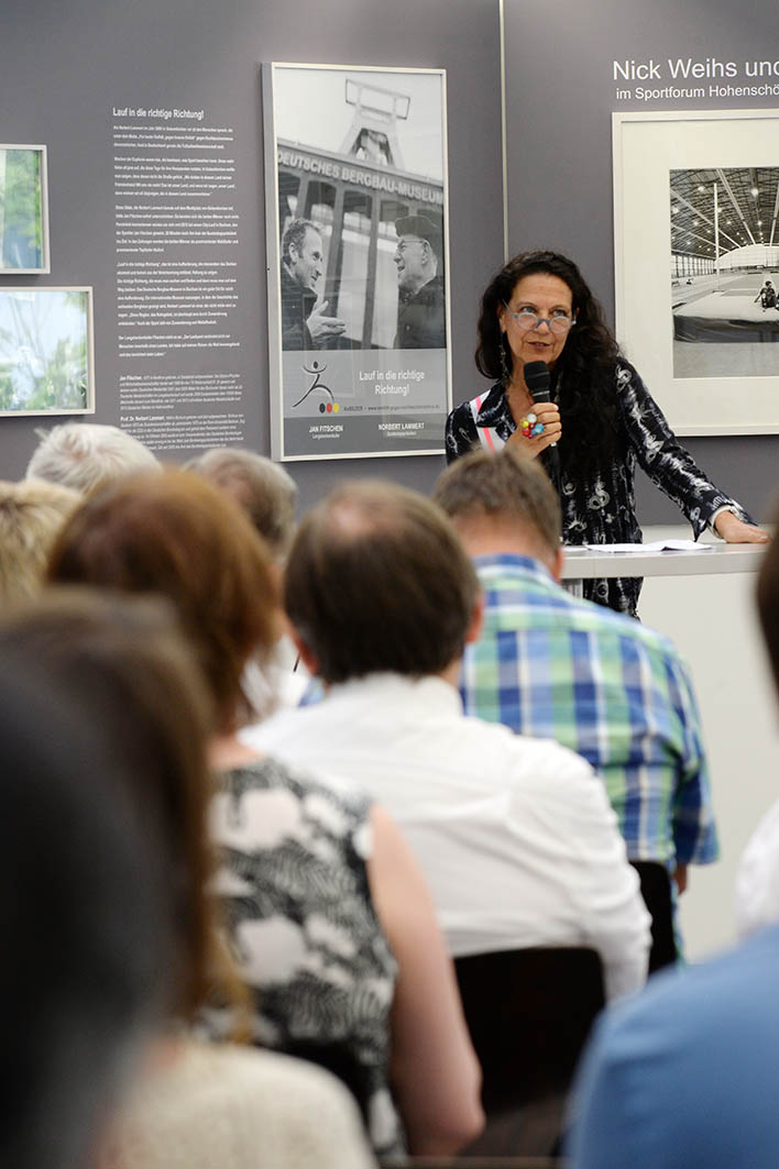 Die Ausstellungsmacherin Angelika Kohlmeier erläutert in ihrer Ansprache die Geschichte, das Konzept und die Umsetzung der VorBILDER und plädiert dafür, sich gerade in der Politik mehr Zeit füreinander zu nehmen. 20 Jahre Erfahrung in der politischen Fotografie habe sie gelehrt, einer Entwicklung ständig wachsender Beschleunigung entgegenzutreten. „Ihr müsst Euch wieder mehr Zeit füreinander nehmen. Ihr müsst Euch mehr Zeit für ein Gespräch nehmen. Dem anderen zuhören, miteinander sprechen. Und nicht von Termin zu Termin hetzen und abends nicht mehr wissen, wo man am Morgen angefangen hat.“