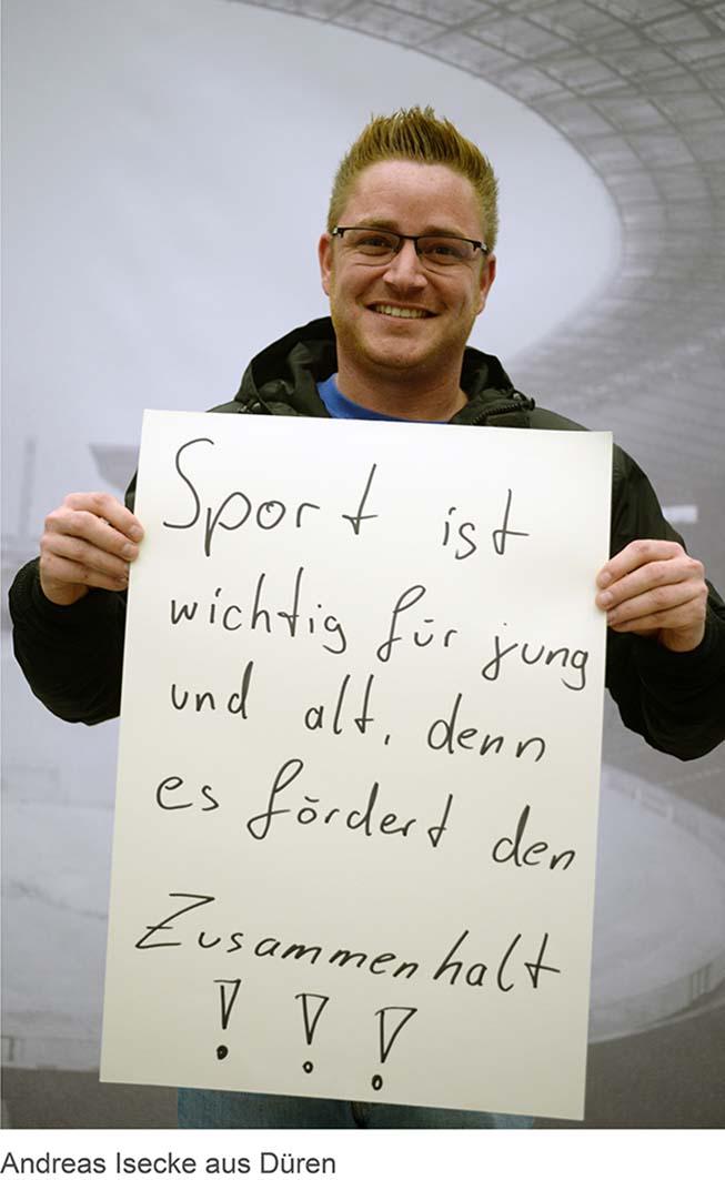 Die Stadt Düren wurde im Zweiten Weltkrieg komplett zerstört, Menschen wurden gequält und deportiert. In seiner Ansprache anlässlich der Eröffnung der Ausstellung „VorBILDER – Sport und Politik vereint gegen Rechtsextremismus“ unterstreicht der Bürgermeister Paul Larue die Notwendigkeit, hieran zu erinnern. Gerade jetzt im November gebe es mehrere Gedenktage an die Gräueltaten der Nationalsozialisten. Die Erinnerungskultur ist fester Bestandteil des Dürener Alltags. 10 Stelen hat der bekannte Bildhauer Ulrich Rückriem in Düren als „Steine des Anstoßes“ an Stellen errichtet, an denen Menschen unter den Nazis gelitten haben. „An jedem Abend eines 9. November versammeln wir uns in Gruppen zum Gedenken an den sogenannten Rückriems“, so Larue. Die Ausstellung VorBILDER, die jetzt im alten Foyer des Dürener Rathauses steht, verstärke die Erinnerung an das, was gewesen ist und werfe darüber hinaus die Frage auf, wo wir heute stehen, so Larue.