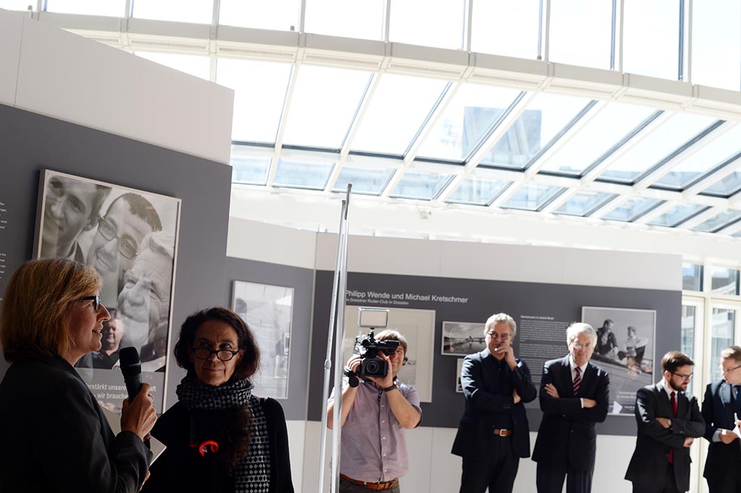 Eine Premiere bietet die Düsseldorfer Ausstellungseröffnung auch noch. Erstmals präsentiert Antje Gansewig eine Handreichung, die ergänzend zur Ausstellung erstellt wurde, die aber auch ohne Ausstellungsbesuch genutzt werden kann: Um die Jugendarbeit von Pädagogen, Übungsleitern, Trainern und Ehrenamtlichen zu unterstützen, hat die Stiftung Deutsches Forum für Kriminalprävention (DFK) in Kooperation mit dem Bundesministerium des Innern eine Handreichung zum Thema Rechtsextremismus im Sport entwickelt und gestaltet. Die Handreichung arbeitet mit den Bildern und Texten der Ausstellung VorBILDER und soll dabei helfen, die unterschwellige Infiltration durch rechtsextreme Strömungen zu identifizieren und entsprechende Gegenstrategien zu entwickeln. Sehen, erkennen und abwehren. Aber die Handreichung klärt auch auf, motiviert zu Zivilcourage, definiert und liefert Ansprechpartner, Anlaufstellen und Adressen. Die Ausstellungsverantwortlichen, Fotografin Angelika Kohlmeier und Projektleiterin Marie-Luise Würtenberger vom Bundesministerium des Innern erzählen vor den zahlreichen Besuchern, wie es zu der Ausstellung kam. Besonders wichtig bei der Umsetzung sei ihnen die Botschaft: Man müsse sich Zeit nehmen für dieses Thema, das uns alle angehe, so Angelika Kohlmeier, deshalb wählten sie die analoge Fotografie. Marie-Luise Würtenberger ist der Kampf gegen Rechtsextremismus, aber auch gegen Alltagsrassismus und Fremdenfeindlichkeit ein besonderes und besonders aktuelles Anliegen. Es gebe nicht „die Flüchtlinge“, sagt sie. „Das sind alles Menschen und wir müssen endlich anfangen, sie auch so zu sehen. Nur dann werden wir es schaffen, Vorurteile abzubauen.“ Die Ausstellung bestehe deshalb nicht nur aus beeindruckenden Fotografien, die an Stellwänden hängen. Mit der Ausstellung verbunden sei immer auch ein Rahmenprogramm, das das Thema vor Ort verankern, das Vernetzung und Begegnungen schaffen solle.