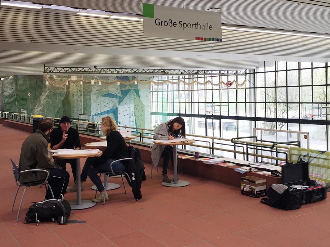 Vor allem die Kinder lieben Linus Krebs, denn er sorgt den ganzen Tag für Spaß und Ablenkung vom eintönigen Alltag. Einem Alltag des Wartens. Denn Linus arbeitet als Freizeitpädagoge für Flüchtlinge in der Erstaufnahmestelle, die gegenüber vom Sportforum der Christian-Albrechts-Universität liegt. Also dort, wo jetzt die VorBILDER zu sehen sind. Hier sind alle in Bewegung, Studierende trainieren in einer Halle Volleyball, in der anderen den präzisen Sprung auf dem Trampolin, Schulklassen, auf dem Weg zum Schwimmunterricht, werden nochmal von der Lehrerin durchgezählt, Flüchtlingskinder rennen, springen und spielen angeleitet von Sportlotsen und das alles in einem einzigen Raum der Begegnungen. Dass die Kooperation zwischen Erstaufnahmestelle und der Universität so gut funktioniert, ist unter anderen auch Bernd Lange zu verdanken. Als Geschäftsführer des Sportzentrums hatte er sich schon bevor er auf Linus Krebs gestoßen ist Gedanken gemacht, wie man den Flüchtlingen durch Sportangebote helfen könnte. Es ist berührend zu sehen, wie die Kinder jetzt ganz unbeschwert durch die Halle flitzen. So lenken die VorBILDER wieder einmal die Aufmerksamkeit auf die Bedeutung des Sports und darauf wie wichtig es ist, im Kleinen Großes zu bewegen.