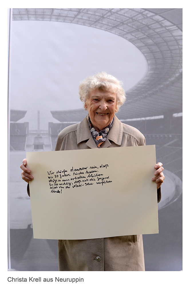 Kalt ist es an diesem frühen Sonntagmorgen in Neuruppin. Besonders im Schatten pfeift einem der Wind um die Ohren. Das mobile Fotostudio wäre fast weggeweht. Ausgerechnet in dem Moment, als Frau Krell ihre Botschaft in die Kamera hält. Mit ihren 94 Jahren hat sie viel gesehen und den Naziterror hautnah erlebt. So etwas soll nie wieder passieren, sagt sie. Sie möchte auf keinen Fall, dass sich die Jugend von der Nazi-Idee verführen lässt. Das steht auch auf ihrem Plakat. Das Engagement der Bürger in Neuruppin ist spürbar. Es gibt einen regelrechten Ansturm auf das mobile Fotostudio und das noch vor Beginn des Gottesdienstes in der Klosterkirche. „Natürlich mache ich mit! Den Nazis muss man entschieden entgegentreten“, sagt eine Frau und greift zum Filzstift.