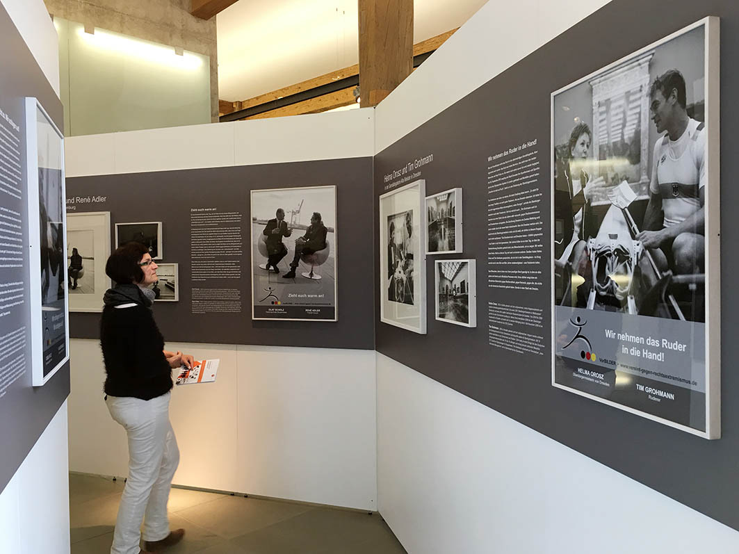 Angelika Kohlmeier schildert in ihrer Ansprache die Entstehungsgeschichte von Fotoserie und Ausstellung, von der Idee bis zur Umsetzung. Dadurch, dass Politiker und Sportler selbst ausgesucht hätten, wo diese Fototermine stattfinden sollten, hätten sich die unterschiedlichsten und ungewöhnlichsten Orte für die Produktion ergeben. „Wir waren zum Beispiel in der Gemäldegalerie in Dresden mit einem 8 Meter langen Einer, wir waren im Berliner Olympiastadion bei minus 10 Grad und Schneefall, wir standen im Neoprenanzug in der Elbe bei Dresden und wir fotografierten in Augsburg im Eisstadion unter Puck-Beschuss. Die Aufnahmeorte waren für uns Fotografen teilweise eine echte Herausforderung“, so Kohlmeier, die gemeinsam mit Bernd Kohlmeier die Ausstellung konzipiert und umgesetzt hat. „Wir kommen aus der politischen Fotografie und […] was ich dort immer erlebe ist, dass man eigentlich überhaupt keine Zeit mehr hat, miteinander zu sprechen und dem anderen zuzuhören und ich glaube, dass es ganz, ganz wichtig ist, dass wir das wieder lernen. Insbesondere in der Politik.“