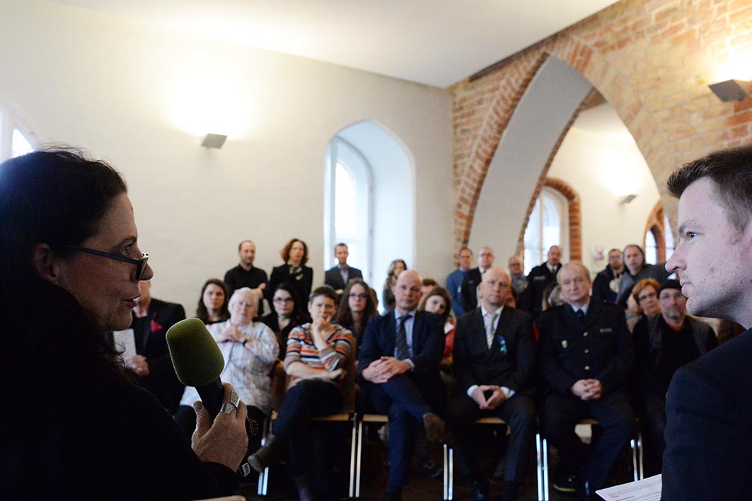 Die Stadt Rostock hat sich für die Moderation der Veranstaltung einen Fachmann ins Haus geholt: der Journalist und Buchautor Ronny Blaschke beschäftigt sich seit mehreren Jahren mit Gewalt, Rechtsextremismus und Menschenfeindlichkeit im Sport, aber auch in der gesamten Gesellschaft. Er leitet am heutigen Eröffnungstag die Podiumsdiskussion. Zu Gast ist auch Marianne Buggenhagen. Gemeinsam mit Wolfgang Thierse hat sie sich mit der Aussage „Ohne Angst anders sein“ für eines der Bilder in der Ausstellung klar positioniert. Für sie ist die Botschaft der VorBILDER eine Herzensangelegenheit, denn Rechtsextreme reduzierten sie auf ihre Behinderung, die sie an den Rollstuhl fesselt. Sie wurde bereits buchstäblich zur Zielscheibe von Neonazis. Gemeinsam mit ihrem Mann, Jörg Buggenhagen, der bei der Eröffnung auch zugegen ist, engagiert sie sich für ein tolerantes Miteinander in unserer Gesellschaft. Mit ihrer Projekttour „Miteinander leben – gemeinsam reden – Sport verbindet!“ spricht sie besonders Jugendliche an. Sie sollen für ein Leben mit Behinderung sensibilisiert werden. In Turnhallen können sie im Rollstuhl über einen Parcours fahren oder sich mit Brillen, die das Blindsein simulieren, von Freunden durch den Raum führen lassen. Eltern und Erwachsene sind ebenso herzlich eingeladen mitzumachen. Marianne und Jörg Buggenhagen schaffen damit Empathie und Verständnis, beantworten offene Fragen und helfen, Berührungsängste abzubauen.