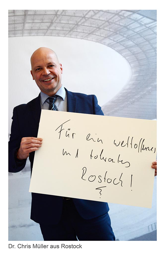Auch ein Vertreter des Fußballs ist gekommen, Robert Marien, der Vorstandsvorsitzende des F.C. Hansa Rostock. Er macht deutlich: „Wir haben eine ganz klare Aufgabe. Sport ist kein politisch luftleerer Raum, deswegen muss man sich klar positionieren. Klar positionieren gegen Rechtsextremismus.“ Mit dabei sind auch Fußballspieler des Rostocker Vereins. Ronny Garbuschewski, Tobias Jänicke und Marcel Ziemer beteiligen sich an den MeinungsBILDERN und setzen damit auch ein wichtiges Zeichen für den Verein. „Fußball verbindet, Fußball vereint, Fußball schafft Toleranz“ steht da in großen Lettern auf ihrem Plakat.